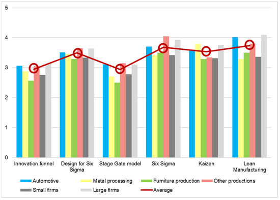 The techniques and methods were evaluated on a scale with five levels, where one means not helpful and five means very helpful. From the results obtained, lean manufacturing appears to be the best technique used in improving processes, while design for six sigma is the best method for developing new products. In addition, the grade obtained by them is 3.74 and 3.5, respectively, which is higher than the average, but still far from the top of the helpfulness scale.