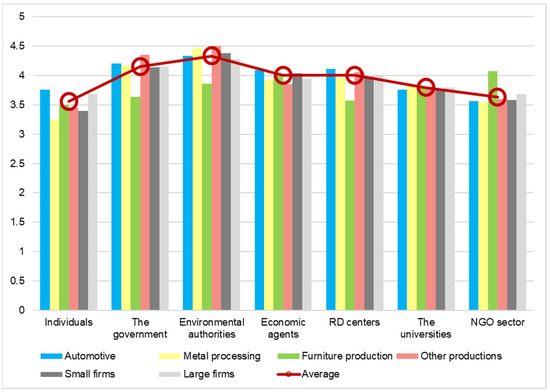 Regarding Romania’s overall level of training in solving environmental problems, the manufacturing companies are concerned that they will not be able to face the future challenges. The concern of the enterprises was measured on a scale with five levels, with one meaning not prepared and five meaning very well prepared. The average obtained was 1.99 which means that solving environmental problems in Romania is perceived as quite difficult. The comparison between small and large firms is insignificant in this case, as small companies obtained a score of 1.98 and large companies obtained a score of 2.02. Regarding a comparison between fields of activity of the companies, the scores obtained in descending order are as follows: other production fields—2.2, metal processing sector—1.93, automotive sector—1.93, and furniture production—1.71. Furniture manufacturers, who are directly processing natural resources for their products, have the lowest opinion on this issue.