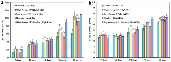 4.1. Effects of CP and Biochar on the Growth of Cucumber Seedlings