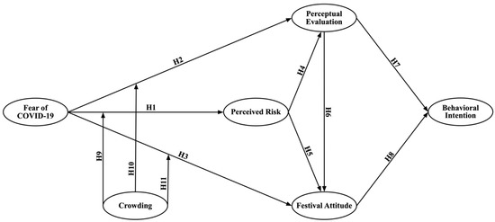 In the wake of the WHO’s announcement that COVID-19 is a pandemic, many people realised that they were at risk for this deadly disease [110], and fear spread in human society. According to the results of this study, fear of COVID-19 does not necessarily negatively affect the intention to participate in the Hanfu festival, and the critical negative factor is participants’ perceived risk. This study finds that perceptual evaluation and festival attitude contribute to increased behavioral intention in festival participants. Fear of COVID-19 has a direct positive effect on perceptual evaluation and perceived risk, but the perceived risk has a direct negative impact on perceptual evaluation. Although fear of COVID-19 and perceived risk do not directly impact festival attitude, perceptual evaluation is a complete mediation factor in these two relationships. Crowding plays a moderating role in the relationship between fear of COVID-19 and perceptual evaluation and between fear of COVID-19 and festival attitude. In conclusion, Hypotheses 1, 2, 4, 6–8, 10 and 11 are supported, while Hypotheses 3, 5 and 9 are not.