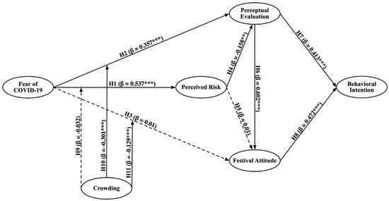 The statistical significance between variables was tested using the bootstrapping resampling method (5000 resamples). The results can be found in Table 6 and Figure 2. Fear of COVID-19 has a significant relationship with perceived risk (β = 0.537, t = 15.034, p < 0.001) and perceptual evaluation (β = 0.357, t = 6.276, p < 0.001), thus supporting H1 and H2. H4 is also supported because perceived risk is significantly related to perceptual evaluation (β = −0.158, t = 2.652, p < 0.01). The path coefficients of perceptual evaluation on festival attitude and behavioral intention are 0.602 (t = 14.331, p < 0.001) and 0.413 (t = 7.926, p < 0.001), respectively. The path coefficient from festival attitude on the behavioral intention is 0.472 (t = 9.08, p < 0.001). These results support H6, H7, and H8.