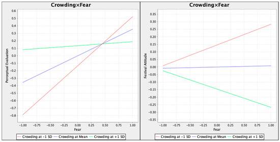 The interactive effect of crowding and fear of COVID-19 are significantly associated with perceptual evaluation (β = −0.301, t = 6.599) and festival attitude (β = −0.129, t = 4.735), suggesting that the moderating effect of crowding is supported, and thus, H10 and H11 are supported. The results of the simple slope analysis (Figure 3) demonstrate that participants who perceived high crowding in the Hanfu festival have lower perceptual evaluation and festival attitude when they perceive the same level of fear. Because the lower crowding line has a steeper slope, the moderation effect of crowding is negative.