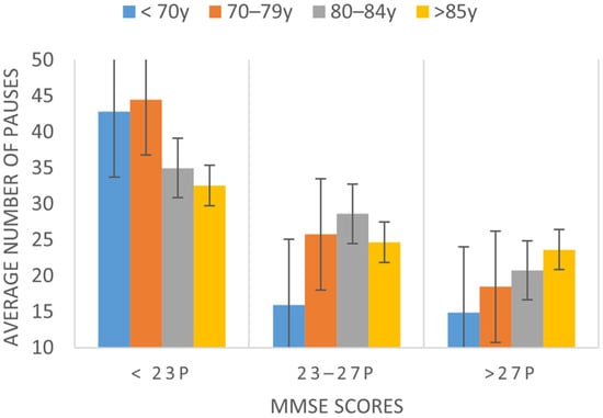 Average number of speech pauses depending on the cognitive state as measured by the MMSE and age ranges.