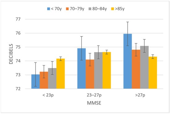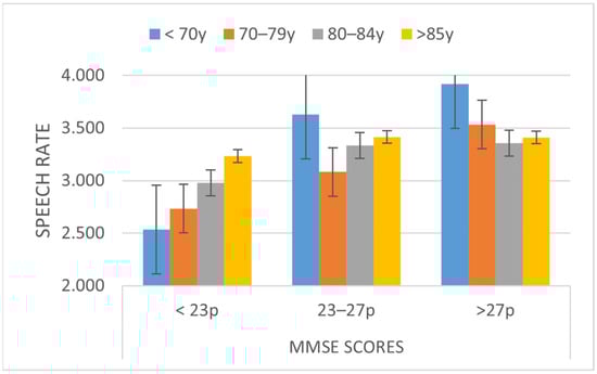 The results were similar for the parameters of speech fluency and rhythm, such as speech rate, average duration of syllabic intervals, standard deviation of syllabic intervals and normalized pairwise variability index of syllabic interval (nPVI). In speech rate (phonemes per second), there was an effect in terms of gender, with women (3.42 ph) being faster than men (3.11) (dif = 0.306, p < 0.01). However, there was no interaction of gender with either the MMSE or age. There was also an effect of the MMSE that showed differences between the participants with MMSE < 23 (2.87 ph/s) and the rest (MMSE = 23–27, diff: −0.496, p < 0.001; and >27, diff: −0.685, p < 0.001). Thus, a cognitive state of <23 implies a significant decrease in the speech rate. A significant interaction effect between MMSE and age was found (F6, 376 = 2.385, p < 0.05). The differences in the MMSE are present in those who are younger than 70 and MMSE > 27 (See Figure 2).