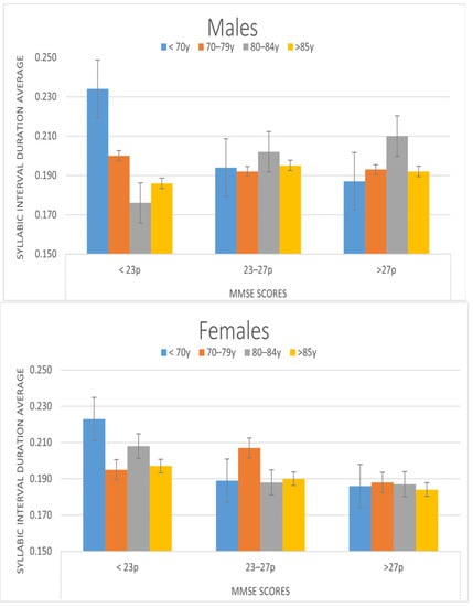 Average Duration of Syllabic Interval depending on the cognitive state as measured by the MMSE and age ranges.