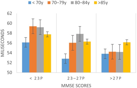Evolution of the nPVI values depending on the cognitive state as measured by the MMSE and age ranges.