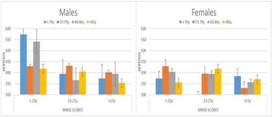 Finally, the standard deviation of Formant 1 parameter (F1sd) depends on the cognitive state, but also on gender and age. On the one hand, significant differences were found between participants with MMSE < 23 (440 hz), and both MMSE 23–27 (diff: 54.32 hz; p < 0.05) and MMSE > 27 (diff: 69.948 hz, p < 0.01). We found no interaction between the two variables of cognitive state and age. However, we found differences due to gender between men (423 hz) and women (374 hz, p < 0.01). In contrast, we did find interaction when the following three variables are compared: age, gender and cognitive state. The differences were found in women with a cognitive state between 23 and 27 points in the MMSE, and under 70 years of age with respect to other groups. There were also differences between men and women younger than 79 years of age and MMSE < 27 (see Figure 6).