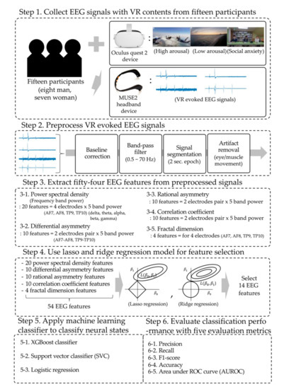 Our experimental design comprised six steps. First, we collected VR-evoked EEG signals from participants in three virtual environment conditions. Second, EEG signals were preprocessed to perform feature extraction. Third, 54 features were extracted from the preprocessed EEG signals. Fourth, lasso and ridge regression models were used to select the proper features from the 54 extracted features. Fifth, we applied three machine learning classifiers to classify emotional neural states based on EEG signal features. Finally, the classification performance was evaluated using five evaluation indices. The detailed steps are shown in Figure 1.