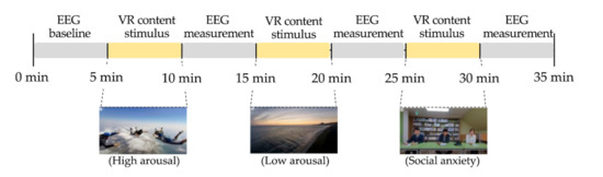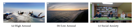The three types of VR content—low arousal, high arousal, and social anxiety—were provided as stimuli. In the low-arousal condition, a virtual calm sea view was shown to experience a low-arousal state. In contrast, environments with skydiving were shown to experience a high-arousal state in high-arousal conditions. A previous study validated that skydiving experiences elicited a hyperarousal state [22]. To arouse a relatively higher emotional state than the aforementioned two conditions, we conducted group interviews under social anxiety conditions. Evoked social anxiety through VR content has been revealed in previous studies [23,24].