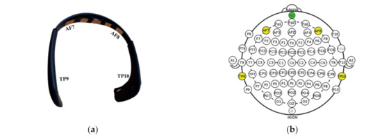 Electrode and channel information of EEG devices used in this study. (a) Muse2 headset band. (b) EEG montage of Muse 2 headset band based on the International 10–20 EEG electrode placement standard [27,28].