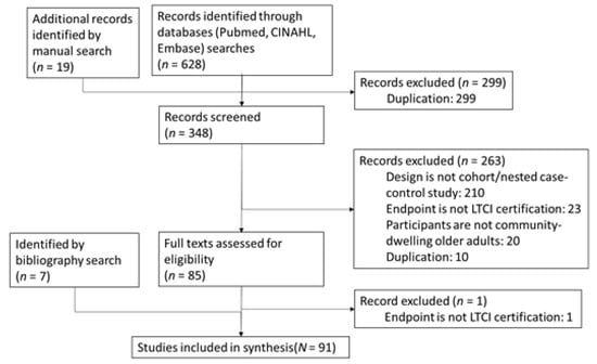 We identified 647 studies: 628 from the database search and 19 from the manual search. Of these, 299 studies were excluded because of duplication. After reading the titles and abstracts, 263 papers were excluded because they did not follow a cohort or nested case–control design (n = 210), the endpoint was not LTC certification (n = 23), study participants were not recruited from the community-dwelling population (n = 20), or they were duplicates (n = 10). Therefore, 85 papers were eligible for full-text review. Of these, one paper [] was excluded from the analysis because its outcome was the trajectory of the Care Need Level. We examined the reference lists of the included studies to identify additional literature, and another seven articles were added. Ultimately, 91 studies were included in the analysis.