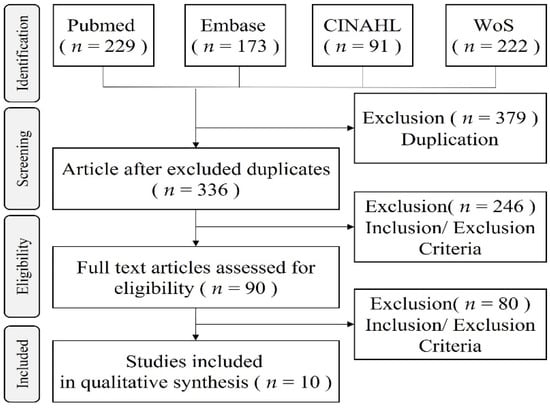 In this study, a literature selection process was performed according to PRISMA’s systematic literature protocol. The researchers used four (4) electronic search databases, Pub//med, Excerpta Medica dataBASE, Cumulated Index to Nursing and Allied Health Literature, and Web of Sciences, as shown in Figure 1. The medical subject headings (MeSH) included “hemodialysis,” “caregiver experiences,” and “qualitative study.” The literature selection criteria are as follows: (1) caregivers as participants; (2) studies were published within the last ten years, from 1 August 2011, to 31 July 2021; (3) studies were published in English in peer-reviewed journals; and (4) participants were ≥18 years old. Exclusion criteria were (1) studies that did not fit the objective of this study, (2) non-English-language studies, (3) quantitative research studies, (4) studies with unclear or complex criteria for participant selection, (5) secondary analysis studies, and (6) studies for which no access existed to the full text. This review process identified 715 studies and eliminated 379 results that were repeated. The title and abstract of the remaining 336 studies were screened to determine if they met the inclusion criteria. Overall, 246 studies that did not meet the inclusion criteria were eliminated. Lastly, the full texts of 90 studies were reviewed, and inappropriate studies were eliminated based on the inclusion criteria. In conclusion, a total of 10 studies were selected for analysis.