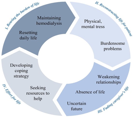 Caregivers go through “bearing the burden of life as a caregiver”, “reconstructing life to maintain hemodialysis”, and “the fading of caregiver’s own life”, and “effort to relieve the burden” was experienced in turn. These efforts again became the strength to “bearing the burden of life as a caregiver”. As such, it was found that these processes have a structure that is organically connected and circulated.