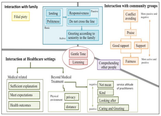 Further analysis revealed that general daily life situations can be subdivided into family and community. Therefore, the following comparison of respect in different contexts is presented as (1) interactions with family members, (2) interactions with community groups, and (3) interactions in healthcare settings (depicted in Figure 1). he elderly’s comparison between “respect in daily life” and “respect in healthcare settings” is concluded as follows: