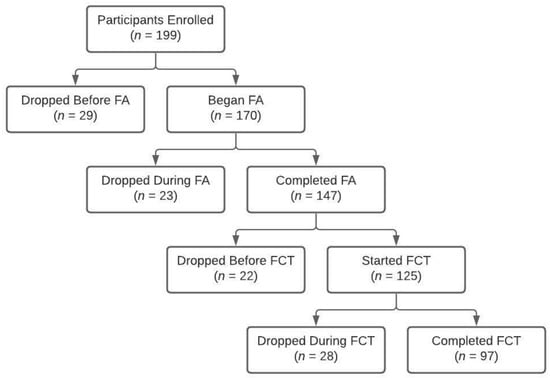 All participants were categorized as completers or non-completers according to the project phase in which they discontinued participation. Completers were defined as participants who completed the FA and FCT phases. Non-completers were defined as participants who discontinued participation prior to the completion of FCT.