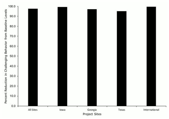 Of the participants who completed FCT treatment (n = 97), the average percent reduction in challenging behavior from baseline levels was 97.4% (SD = 8.2; range, 57–100%; Figure 2). Very similar differences in the percent reduction in challenging behavior occurred across project sites.