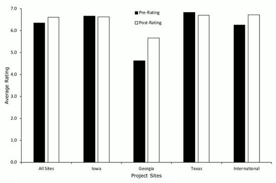Parent ratings of treatment acceptability averaged 6.4 (SD = 1.0; range 4–7) and 6.6 (SD = 0.8, range 4–7) at pre- and post-treatment, respectively, across all project sites (Figure 3). These results did not differ across sites, except for the generally lower ratings obtained at the Georgia site. Pre-treatment ratings at the Georgia site averaged 4.6 (SD = 1.1, range 4–7) and post-treatment ratings averaged 5.7 (SD = 1.4; range, 4–7). However, variable levels of data were missing across all sites (range, 0% to 72.7%), which may have impacted these results. Specifically, for pre-treatment TARF-R ratings, data were missing for 6.3%, 8.0%, 63.6%, and 66.7% of children at the Texas, International, Georgia, and Iowa sites, respectively. For post-treatment TARF-R ratings, data were missing for 0.0%, 25.0%, 55.6%, and 72.7% of children at the International, Texas, Iowa, and Georgia sites, respectively.