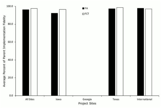 Parent procedural fidelity during the FA and FCT averaged 96.2% (SD = 6.0; range, 75–100%) and 97.6% (SD = 4.3; range, 70–100%), respectively, across all project sites (Figure 4). Except for the Georgia site, which did not collect parent procedural fidelity data, parent procedural fidelity did not differ across the FA and FCT when separated by project site.