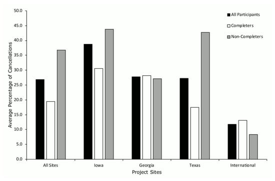 Across all participants and all sites (n = 199; black bars), the average percentage of visit cancellations was 26.8% (Figure 5) with visit cancellations averaging the lowest for the international site (11.8%) and highest for the Iowa site (38.8%). When cancellations were analyzed by participants who completed the project (n = 97; white bars) versus those who discontinued participation in the project (n = 102; gray bars), the average percentage of visit cancellations was 19.4% for completers and 36.7% for non-completers across all sites. Similar to the cancellations for all participants by site, the international project showed the lowest average cancellations for completers (13.1%) and non-completers (8.3%), and the Iowa site showed the highest cancellations for completers (30.5%) and non-completers (43.8%).