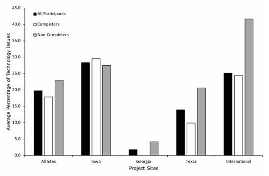 Technology issues (Figure 6) occurred across all sites (black bars) with an average 19.7% of occurrence, with similar occurrences when evaluated by participants who completed the project (17.8%; white bars) and participants who discontinued their participation in the project (22.9%; gray bars). Across all participants, the Iowa and international sites had the highest average occurrence of technology issues (M = 28.4% and 25.1%, respectively), and Georgia had the lowest average occurrence of technology issues (M = 1.9%). For participants who completed the project, Iowa had the highest occurrence of technology issues (M = 29.6%) and Georgia had the lowest occurrence (M = 0.0%). For participants who discontinued participation in the project, the international site had the highest occurrence of technology issues (M = 41.7%) and Georgia had the lowest occurrence (M = 4.2%). However, the Georgia site was also the most inconsistent site for collecting data on cancellations and technology issues.