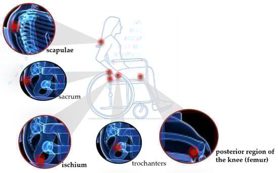 The advances in knowledge associated with the development of science and technology, as well as the increase in the average life expectancy of people, has led to a constant search for solutions in the field of health to improve the quality of life of the population. Often, these solutions do not lead to the cure of a pathology, but instead focus on its treatment and/or prevention. In this work, we propose a solution to improve the life quality of people who, for various reasons, have limited mobility and are bound to the daily use of a wheelchair. Due to the prolonged use of such mobility aid, wheelchair users may suffer from different pathologies, with pressure ulcers being one of the most recurrent, which in more severe cases may precede a generalized infection and lead to the death of the patient []. A pressure ulcer is a lesion on the skin and/or underlying tissue, resulting from prolonged exposure of a given anatomical region to pressure or pressure combined with torsional forces [,]. Additional pressure applied to a specific area of the skin impairs blood flow, resulting in a decrease in oxygen and nutrients to that area (ischemia) when sustained for a long period of time []. If this pressure is not relieved, an ulcer will begin to form. Therefore, in wheelchair users, this additional pressure combined with limited mobility, low sensitivity, poor nutrition, ageing of the skin, and increase in temperature and humidity can eventually lead to the development of ulcers [,]. The most common areas for the development of this pathology are ischium and sacrum; scapulae; and, in some cases, trochanters and posterior region of the knee, depending on the chair and the position most frequently assumed by the user [,] (Figure 1). It is estimated that 95% of wheelchair users develop pressure ulcers during their lifetime [], which is why it is considered one of the most critical secondary complications for patients with bone marrow damage []. Additionally, several studies show that the treatment of pressure ulcers causes high costs for both patients and health services. An article published in 2010 mentions that the treatment of a stage 4 pressure ulcer can cost as much as USD 129,248 per patient [].