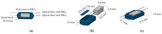 The sensor cell design was created with higher PLA walls on the sides of the resin (0.5 mm) and lower walls on the transverse tops so that the resin moves longitudinally and promotes elongation of the optical fiber when it is under pressure. Each sensor cell resin block, shown in shades of gray in Figure 2a,b, is 15 mm long, 6 mm wide, and 6 mm high. Figure 2c depicts the final assembled sensor cell.