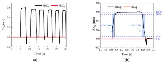The response time of the projected sensor cells to pressure variations was determined by placing and quickly removing a mass of approximately 4 kg on the six sensor cells. The data were collected using an I-Mon USB512 interrogator (Ibsen Photonics) due to its high acquisition frequency (≈1 kHz), with a resolution of 5 pm and wavelength range of 70 nm. According to the results shown in Figure 3a, for the IR sensor cell, as expected, no Bragg wavelength shift was obtained in the case of the FBGT sensor. The determination of the response times of FBGP for the rise and fall of all cycles only considered the analysis of the elapsed time between 10 and 90%, as shown in Figure 3b. An average rise time of 0.30 s and a fall time of 0.38 s were obtained. The difference between the values may have been due to the fact that the resin itself took time during the descent to return to its original position. In any case, both values were quite low for the type of movement to be detected in this work, and therefore the sensor design here proposed was proven to be suitable for the intended application. Since the response time is about 0.5 s, the sm125–500 interrogator (Micron Optics), another interrogation system available in our laboratory, which registers two points per second with a resolution of 1 pm and a wavelength range of 80 nm, is suitable for the sensor calibration, and therefore it was the interrogator used during all tests.