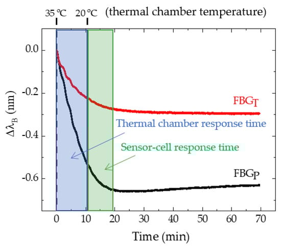 The Micron Optics sm125–500 interrogator was used to record the Bragg wavelength for FBGP and FBGT. At the beginning of the test, at minute 0.0, the thermal chamber displayed 35.0 °C, having been programmed to 20.0 °C at that time. The desired temperature was reached 10.6 min after the start of the test. As shown in Figure 4, 20.0 min after the thermal chamber was turned on, the temperature of the FBGP and FBGT was considered stabilized.