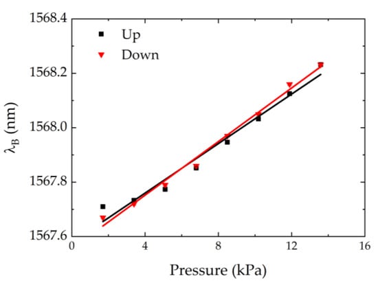 For all sensor cells, these tests resulted in a linear dependence of the Bragg wavelength change with the applied pressure. The sensitivity coefficient of each sensor cell was given by the average of the slopes of the linear fits for the up and down pressure. The results are presented in Table 1. From Figure 5, it can be deduced that the hysteresis effect was very low and can therefore be neglected. The same occurred with the other sensor cells.