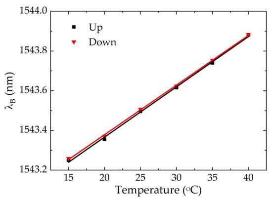 where λB is the reflected Bragg wavelength, neff is the effective refractive index of the optical fiber core, and Λ is the grating period [].