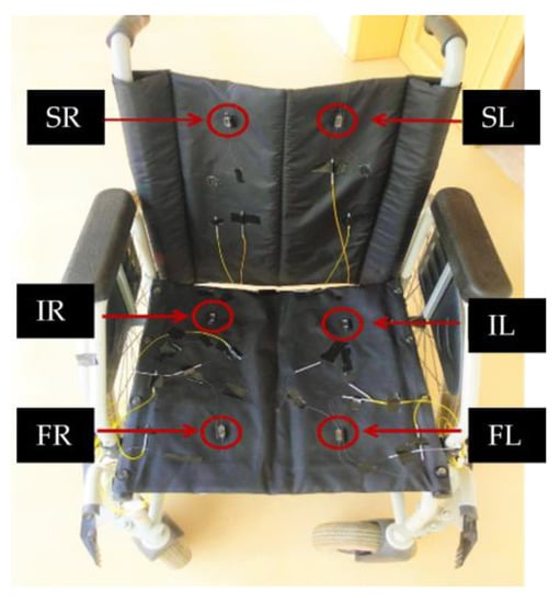 Photography of the wheelchair with the identification of six FBG-based sensor cells for pressure and temperature monitoring.