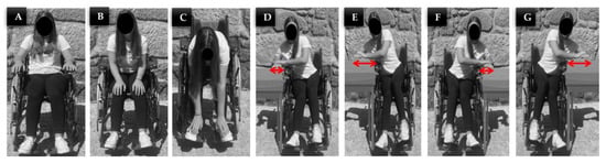 Positions performed during the test: (A) reference position, person sitting normally; (B) leaning slightly forward with hands on knees; (C) leaning strongly forward with hands on feet; (D) slight tilt to the right; (E) too tilted to the right; (F) slight tilt to the left; (G) too tilted to the left.