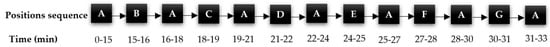 All the tests were performed by the same person, who weighed 58 kg, had no identified pathologies, and was able to move and perform the different positions without external assistance. In accordance with the areas most prone to the development of pressure ulcers, we carried out the protocol demonstrated in Figure 8, consisting of a set of pressure relief positions, as recommended in the literature [,]. The tests were realized in a closed indoor environment at a constant temperature.