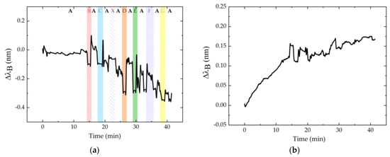 Bragg wavelength shift for the FBGP (a) and FBGT (b) of the SR sensor cell. In the first graph (a), each color refers to the position that was exercised at that moment: position A in white; B in red; C in blue; D in orange; E in green; F in dark blue; and G in yellow. The white area with pattern corresponds to a random movement of the volunteer (identified as X).