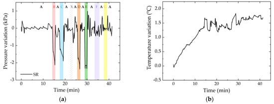 Pressure with temperature compensation (a) and temperature (b) of the SR sensor cell during the test. In the first graph, each color refers to the position that was exercised at that moment: position A in white; B in red; C in blue; D in orange; E in green; F in dark blue; and G in yellow. The white area with pattern corresponds to a random movement of the volunteer (identified as X).