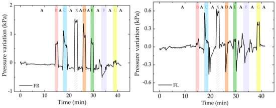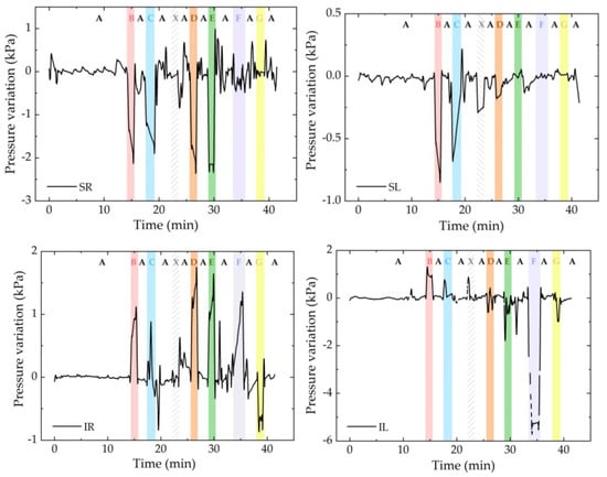 Pressure variation for all sensor cells during the test. In the graphs, each color refers to the position that was exercised at that moment: position A in white; B in red; C in blue; D in orange; E in green; F in dark blue; and G in yellow. The white area with pattern corresponds to a movement of the volunteer (identified as X).