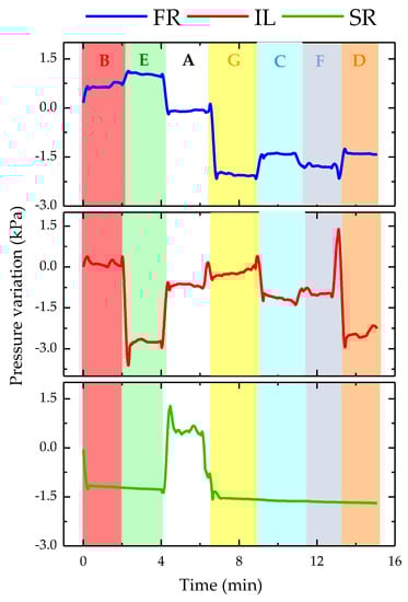 This test aimed to verify the reliability of the proposed optical sensor network for real-time detection of the wheelchair user’s position. For this, the volunteer sat in the wheelchair and randomly adopted the positions described in Figure 8. Since this test was performed immediately after the one described previously in Section 4.1, the initial 15 min required for the temperature stabilization was not considered (this condition was already guaranteed). To identify the seven positions of the wheelchair user, we only needed to analyze the response of three sensors as long as they met two criteria: use of sensors from opposite sides of the seat and use of sensors from all areas of analysis (scapulae, ischium, and femur). Thus, to simplify the analysis, we show in Figure 13 the pressure variation plots only for three sensors, namely, FR, IL, and SR sensor cells.