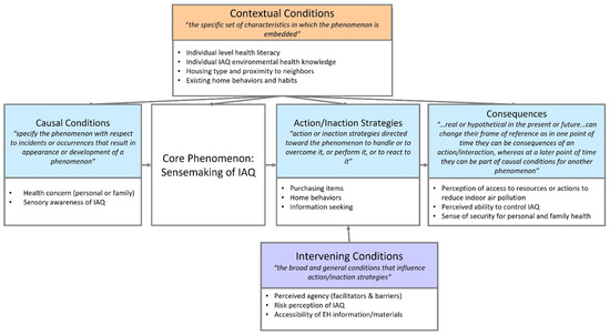 Sixteen categories emerged from the interview data, including the core category Sensemaking of Indoor Air Quality (IAQ). Sensemaking of IAQ emerged as the core category by meeting the six requisite criteria outlined by Strauss & Corbin: (1) all categories relate to the core category; (2) the core category appears frequently; (3) data are not forced to relate to the core category; (4) the core category is sufficiently abstract to be used in alternative areas; (5) the theory grows and deepens its explanatory power throughout theory refinement; and (6) the core categorical concept stands in varying settings [28]. The core category and other subcategories are displayed along with their properties in Table S2, which also provides dimensionalized examples of each of the categories to demonstrate the variety within each of the categories [28].