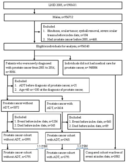 Individuals in the prostate cancer with ADT group were enrolled if the data indicated (1) an ICD-9 or ICD-10 diagnostic code of prostate cancer; (2) the arrangement of one of the following treatments: LHRH agonists, antiandrogens, aromatase inhibitors, estrogens, or bilateral orchiectomy, according to the associated procedure codes or ATC codes; (3) male sex; (4) age from 40 to 100 years. For more details, the development of prostate cancer was defined as the receipt of a prostate cancer-related diagnostic code, and the prostate biopsy and alpha-fetoprotein exam needed to be arranged before the appearance of related diagnostic codes. The performance of prostate biopsy as well as alpha-fetoprotein exam was based on the procedure codes. In addition, we excluded males younger than 40 years old because men of this age are rarely diagnosed with prostate cancer in the clinical situation in Taiwan. The index date was defined as 6 months after the initiation of ADT in patients with prostate cancer. To exclude some conditions that may impact the results significantly, the following exclusion criteria were used: (1) blindness before the index date, according to the related ICD-9/ICD-10 diagnostic codes; (2) diagnosis of ocular tumor before the index date, according to the related ICD-9/ICD-10 diagnostic codes; (3) receipt of eyeball removal surgery before the index date, according to the procedure codes; (4) severe ocular trauma, such as eyeball rupture or corneoscleral laceration, before the index date, according to the related ICD-9/ICD-10 diagnostic codes; (5) development of outcome, according to the related ICD-9/ICD-10 diagnostic codes (mentioned in the next section); (6) receipt of ADT before the diagnosis of prostate cancer, according to the related ICD-9/ICD-10 diagnostic codes, procedure codes, or ATC codes; (7) prostate cancer diagnosed before 2001. Then, each patient in the ADT group was matched to one subject with prostate cancer, but without ADT, and two subjects without both ADT and prostate cancer, and the latter served as the control group. The matching process was conducted using the propensity score matching (PSM) process, according to age, socioeconomic status, and education level. If a patient with prostate cancer who was receiving ADT could not be matched to one patient with prostate cancer, but without ADT, and two patients without prostate cancer, that person was removed from the present study. A total of 1791, 1791, and 3582 patients were enrolled in the prostate cancer with ADT group, prostate cancer without ADT group, and the control group, respectively. The process of subject selection is illustrated in Figure 1.