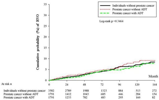 We also found that hypertension significantly increased the risk of developing RVO. This finding is similar to that of previous studies, which showed that uncontrolled hypertension is a known risk factor for the development of RVO []. In addition to hypertension, some studies suggested that other conventional risk factors for atherosclerosis, including hyperlipidemia and DM, play a role in the pathogenesis of RVO [,]. In our study, we found no association between RVO and comorbidities, such as hyperlipidemia, DM, and cerebrovascular and cardiovascular diseases. A possible explanation for this is that we used multivariable analysis in this study, and, thus, the effects of these covariates were diminished by the effect of hypertension, whereas the previous study did not apply such an analysis. Further observational studies may be required to better determine the role of these comorbidities in patients with RVO. In regards to the procedures prior to ADT in the prostate cancer with ADT group, the patients who received combined surgical and radical management accounted for most of the cases. Concerning the influence of these procedures on the outcome of ADT, combined therapy may, theoretically, lead to a better outcome. However, because the tumor staging and image cannot be obtained from the NHIRD/LHID, we cannot evaluate the related results in the current study. Moreover, there are few studies that discuss the relationship between these procedures and subsequent/co-existing systemic morbidities, such as vascular or metabolic disorders. Further research may be needed to evaluate the potential effect of these procedures on the therapeutic outcome and co-morbidities.