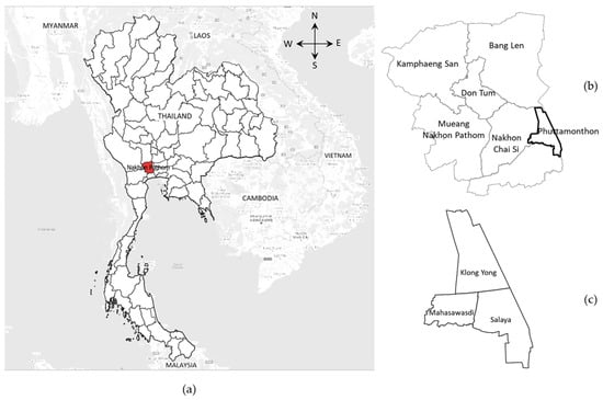 The study setting: (a) a map of Thailand (b) Phutthamonthon District, Nakhon Pathom Province of Thailand (c) three sub-districts of Phutthamonthon.