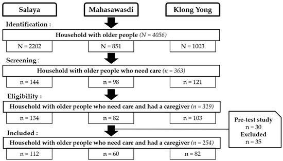 Before the actual data collection, a list of households with older persons was compiled. A total of 4056 households with older people in three sub-districts (Salaya, Mahasawasdi, and Klong Yong) were identified by the medical records officers of the Phutthamonthon District Hospital and the Sub-district Health Promoting Hospitals. Among the 4056 households, 363 were identified as having an older person(s) who needed care, and this information was verified by home visiting teams and the village volunteers from each local hospital. However, after screening with a household questionnaire, it was evident that a total of 319 households actually had an older person(s) who needed a caregiver. Of the 319 households approached, 30 households were allocated for pre-test measurement of questionnaire reliability, 19 households were excluded based on the lack of consent to participate, and 16 households were excluded due to an incomplete questionnaire. Ultimately, 254 households were included for the data analysis (Figure 2).