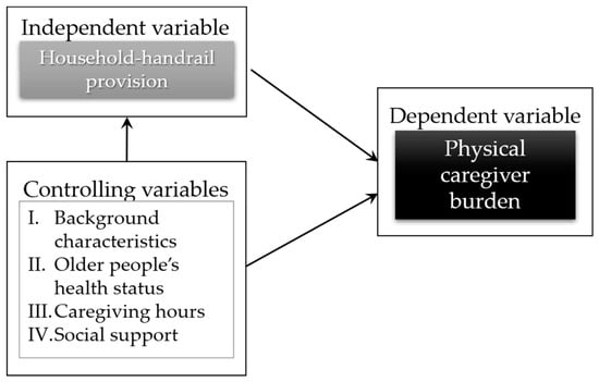 All statistical analyses were carried out using STATA/SE 14.0 [49]. The value for alpha was set at 0.05 for statistical significance; all tests were two-tailed. Descriptive analysis was performed to summarize the distribution of the background variables and to explore the quantitative level of physical caregiver burden. Ordinal logistic regression models were applied to predict the relationship between household handrail provision and physical caregiver burden. The models not only account for the ranked response inherent in ordinal scales, but can also adjust for confounding and determine effect modification from a modest sample size [50,51]. The model analysis of this study is based on combining theoretical frameworks on the caregiving stress process of Pearlin [24] and Yates [25], as shown in Figure 3.