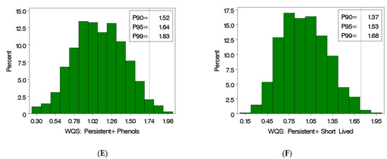 Suppose we set a “policy” to reduce the WQS index to one SD below its mean which is equivalent to the stratified interaction WQS index having a value less than 1.74 (Figure 2A), to reduce the adverse impact of the EDCs on important developmental markers (e.g., seven-year IQ). Recall, the WQS index is a stratified weighted index based on deciles from the population. To reduce the index using the pre-specified quantile designations with fixed weights would require the concentrations of many of the components be reduced. Of course, some of the components are environmentally persistent (i.e., the PFAS and persistent chlorinated, Figure 1) and cannot be readily reduced. In the SELMA cohort, roughly 26% of the WQS index for individuals is due to persistent compounds (Figure 2B). To reduce the WQS index below the target value without a change in the persistent chemicals, the remaining chemicals would have to be reduced to a point where their part of the index was 30% of the observed value (Figure 2C), where 99% of the subjects would have an adjusted WQS value below the suggested target of 1.74 (i.e., one SD below the mean). In comparison, we considered the scenario where the plasticizers were eliminated. The distribution of the adjusted WQS Index (Figure 2D), consisting only of the persistent chemicals, the phenols, and the other short-lived chemicals, is not an adequate adjustment as only 75% of the subjects fall below the suggested target. However, eliminating both the plasticizers and the other short-lived chemicals (Figure 2E) or the plasticizers and the phenols (Figure 2F) results in more than 95% of the subjects with values below the suggested target. These hypothetical scenarios demonstrate how the metric of prenatal exposure to 26 EDCs related to seven-year IQ, in a causal framework, can be used to suggest reduction strategies in environmental chemicals leading to potential improvements in public health.
