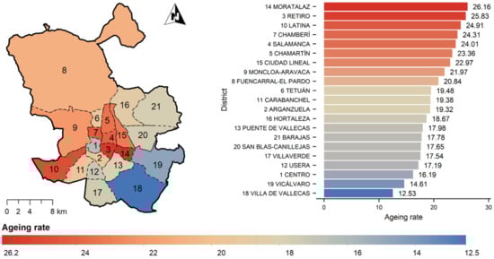 Spain, together with Japan, Finland, Sweden, Greece, Italy, and Germany, is among the countries in the world with a larger number of older adults. In 2019, approximately 19.3% of Spanish people were over the age of 65, and almost 6% were over 80 years old [47]; this figure could reach 40% in 2060 [48]. The city of Madrid offers a good case study for this research as it is the capital of one of the most rapidly ageing nations in the world and it also has a high proportion of elderly residents (19%). Large cities offer opportunities for better management of dedicated aging resources, and Madrid has almost 3.5 million inhabitants and is administratively divided into 21 heterogeneous districts, which are further subdivided into 131 neighborhoods (barrios). Figure 1 shows the ageing rate per city district in Madrid, revealing a higher ageing rate for central districts. In this case study, there is a great heterogeneity in terms of administrative district surface, and bigger districts are located in the periphery of the city, involving a lower residential proportion, and a lower population density and aging rate. In terms of number of inhabitants, although districts located in the periphery have low density, due to their high surface area, their population (number of inhabitants) is higher than that of central districts.