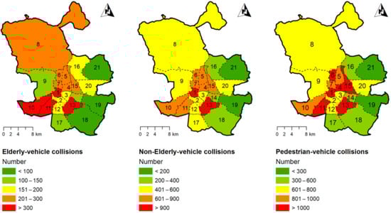 Geolocation of the accidents is a key issue in this research, as accidents will be assigned to the Madrid city district they occurred in. A logical process was developed to geolocate these accidents from the available alphanumerical information about their position (i.e., street name and number or two street names if the location is a junction). It was possible to geo-locate 93% of the vehicle–pedestrian collisions. As a result, Figure 2 shows the number of collisions suffered by elderly pedestrians, non-elderly pedestrians, and all pedestrians per Madrid district for the period 2006–2018. A larger number of accidents are in the central districts in comparison to the periphery. Moreover, the figure shows that the area (surface) of districts is quite heterogeneous, and this heterogeneity is also common for other district variables, such as their road network, and other built environment indicators. Moreover, this heterogeneity is also maintained, to a greater or lesser extent, inside each district.