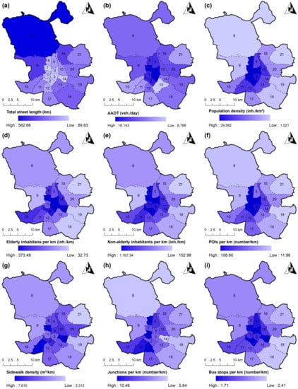 Spatial distribution of built environment variables in Madrid case study in 2018: (a) total street length, (b) AADT, (c) population density, (d) elderly inhabitants per kilometer, (e) Non-elderly inhabitants per kilometer, (f) POIs per kilometer, (g) sidewalk density, (h) junctions per kilometer, and (i) bus stops per kilometer.