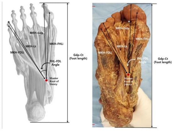 The dissection of the sole was performed as a routine procedure from the superficial to the second layer. Landmarks and measurement parameters for length measurement were defined as follows: Gdp-Ct (foot length), from great toe distal phalanx to calcaneus tuberosity; MKH-Gdp, from Master Knot of Henry to great toe distal phalanx; MKH-FHLi, from Master Knot of Henry to FHL insertion; MKH-Lt, from Master Knot of Henry to little toe distal phalanx; MKH-FDLi, from Master Knot of Henry to FDL little toe insertion (Figure 1). MKH was defined as the point where FDL intersects FHL, and the angle between FDL and FHL was measured based on each structure. For all measurements, two main authors agreed on the selection of the measurement point, and the measurements were performed once together. The length of the sole structure was measured with a digital caliper (NA500-300S, Blue bird, Seoul, Korea). Additionally, the angle between the FHL and FDL was measured using a protractor.