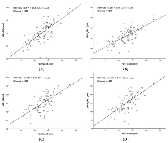 Figure 2 shows a scatter plot and linear regression line for each length variable versus foot length. As a result of the regression analysis performed to estimate each length variable versus foot length, it was found that foot length had a significant effect on each length variable (p < 0.001). The explanatory power of foot length to describe each length variable was 56.3% for MKH-Gdp, 54.1% for MKH-FHLi, 49.9% for MKH-Lt, and 52.3% for MKH-FDLi. Through simple linear regression analysis, the regression equation for the prediction of each length variable, according to foot length, is as follows (Figure 2):
