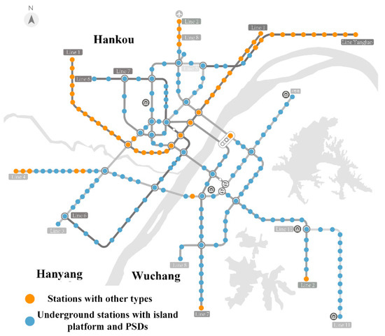 - Perspective 3: Airflow organization mode and pollutant sources. This classification perspective is based on whether the station adopts the PSD system. PSDs will change the airflow organization mode and can also greatly prevent pollutants from the tunnels from entering the platforms. For safety reasons, the majority of stations in China use PSD systems, and Wuhan is no exception, with all underground stations equipped with PSD systems. To ensure generality, the stations with PSD systems will be used for this study.